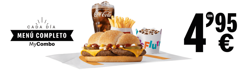 ¡McDonalds presenta su nuevo MyCombo por solo 4,95€! Este nuevo menú consta de un principal y tres complementos entre 3 principales y 9 complementos a elegir. ¡Disfruta ahora de McDonalds sin excusa con su nuevo menú económico! McDonalds, tu restaurante de confianza.
